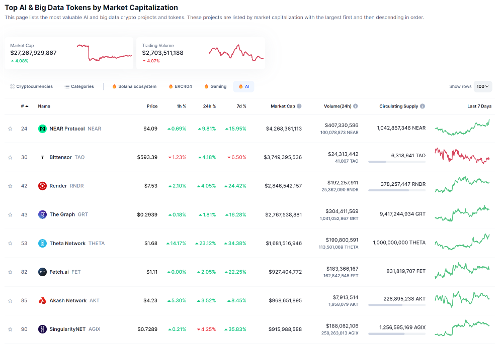 ※ 참고 - 코인마켓캡(coinmarketcap) 기준 Top AI & Big Data Tokens by Market Capitalization