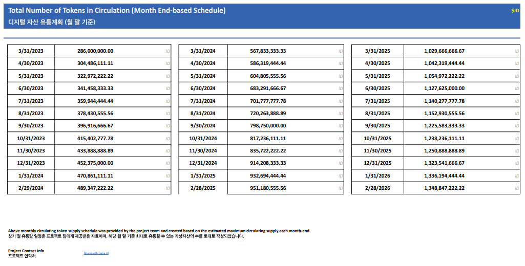 앞으로 얼마나 많은 스페이스아이디가 시장에 나오게 될지 알아봅시다. 2024년 5월 약 6억개 그리고 연말에는 약 9억개로 코인의 갯수가 증가합니다. 이 부분을 유의하시기 바랍니다.
